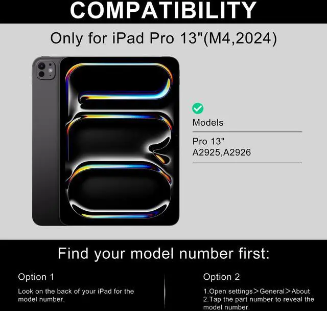 Keyboard Case for iPad Pro 13 inch 2024This iPad keyboard case is perfectly for New iPad Pro 13 Inch (M4) released in 2024 (Models: A2925/A2926/A3007). NOT compatible with any other iPad models. Please check back bottom of your iPad to find the model number. ^^ Stable Bluetooth Connection & Long Battery LifeConvenient and fast Bluetooth connection allows you to use the keyboard anywhere, anytime. And its keys are quiet and comfortable. The iPad Pro 13 inch keyboard adopts the more general type-c interface, charging for 2-3 hours, and can work continuously for up to 70 hours under normal use. The iPad 13 Pro case with keyboard comes with power-saving mode, long periods of non-use will enter the hibernation state. ^^ Premium Leather with Multi-View Angles Case for iPad 13 inchThe high quality iPad Pro 13 inch case 2024 is made of premium vegan exterior composition leather and soft anti-slip lining, a protective keyboard cover gives your iPad 360front and back protection from accidental scratches. And iPad 13 Pro case has multiple viewing angles, you can choose your optimal angle to use your iPad. Type, sketch, view and readif you need to get something done on your iPad, choose from four versatile use modes to get it done.