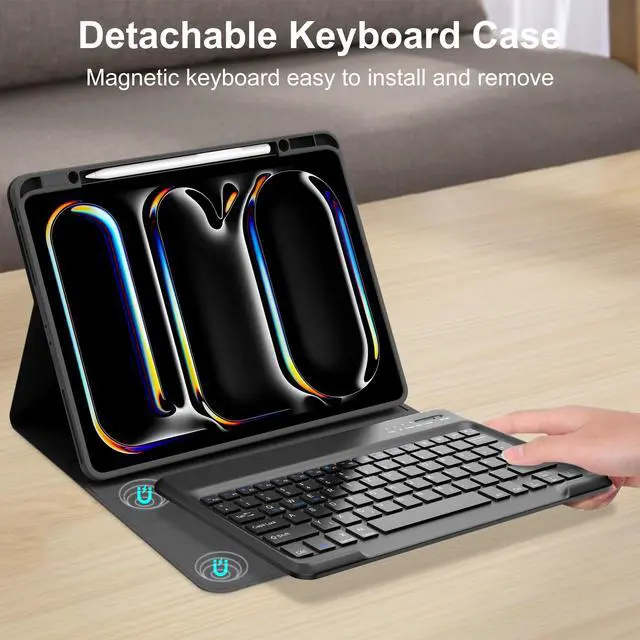 ^^ Built-in Upper Pencil Holder & Support Wireless Charging for Apple Pen Apple iPad Pro 13 inch case 2024 m4 with apple pen slot for daily storage, never worry about get lost. The case also support apple pencil wireless charging, no need to take off the case. ^^ Auto Sleep/Wake Function & Precise Cutout CaseThe iPad Pro 13 inch keyboard case 2024 automatically locks or unlocks your screen when the lid is opened or closed in case only mode to conserve battery life and keep all the important things you may be working on safe. Precise cutout allows full access to all ports: user interface, sensors, speakers, microphone and cameras. ^^ iPad Pro 7th Gen Keyboard Case 13 inch with 100% SatisfactionThis smart folio keyboard case for iPad Pro 7th generation 13-inch m4 with shockproof TPU inner, protect your iPad from scratches, the keyboard keys has resilient, making typing more sensitive and accurate. We will provide you 12-month warranty and 30-day money-back guarantee since your purchase date. At the same time, if you have any question and need, please feel free to contact us, we will solve your problem within 24 hours.
