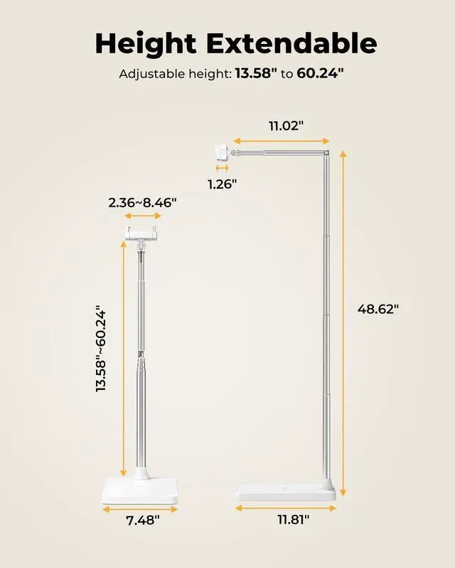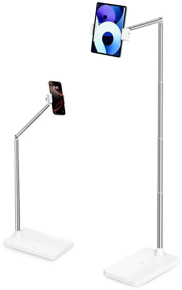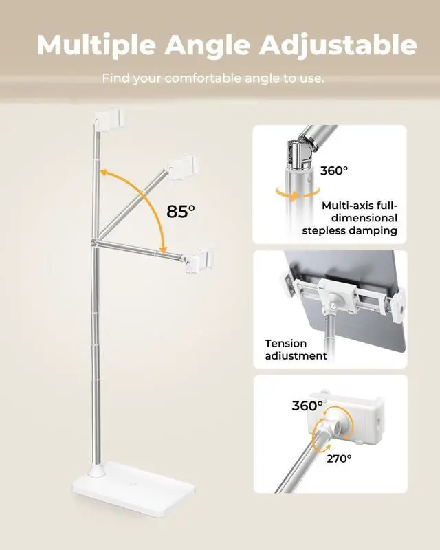 Perfect Bedside iPad Holder & Hands-Free Floor Stand Designed as the ultimate bedside companion, this floor stand securely holds your iPad, tablet, or phone at the perfect height and angle for comfortable viewing while lying in bed. Enjoy videos, read, or video call completely hands-free. ^^ Extensive Height & Flexible Angle Adjustment Achieve the perfect view from any position. Extend the stand from a low 13.5 up to 60.3 tall. The long arm bends 85, rotates 360, and the clamp tilts 720, offering endless positioning for sitting, standing, or lounging.