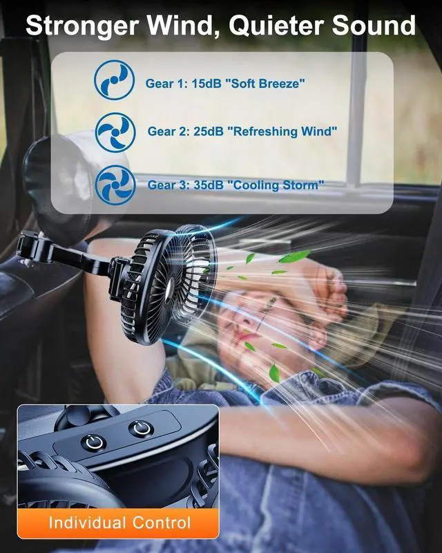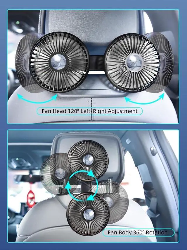 Adjustable in Any DirectionThis car backseat fan can be rotated 360 as a whole, adjusted 180 left and right, and the dual heads are independently adjustable by 120, so it can cool or ventilate passengers or pets in every corner of the car, whether in the front seat or the back seat. ^^ 3 Speeds, Independent ControlThis dual-head car seat fan has 3 speeds, each fan has independent control buttons, which can immediately provide strong air to cool backseat passengers and backseat pets when the car air conditioner is weak or not available at all.