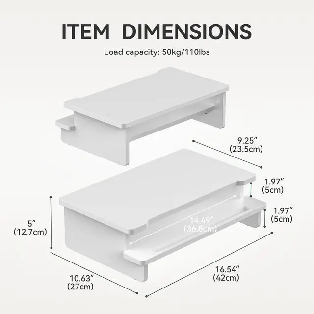 Ergonomic Design for Healthier Work Habit The monitor stand riser elevates your monitor 5 to eye level, promoting proper posture and helping reduce neck, shoulder, and back strain during long work hoursperfect for home offices and workspace ^^ Stable, Space-Saving Base4 Non-slip feet provide excellent grip on any desktop surface, preventing scratches and wobbling, while the compact footprint ( 16.54 x 10.63 x 5) maximizes desk efficiency ^^ Built to Last with Premium Materials Crafted from high-density MDF panel, this monitor riser offers a sleek, modern look while supporting up to 110 lbsideal for monitors, all-in-one PCs, or heavy displays ^^ Smart Storage & Cable Management Integrated phone and tablet holder keeps your devices secure and within reach, while the spacious platform of the computer stand helps declutter your desk, creating a clean, organized workspace ^^ Safe & User-Friendly Design Smooth rounded corners prevent accidental bumps, and the tool-free assembly ensures quick and easy setupno hassle, no frustration ^^ Customer SupportAny questions, problems & recommendation is welcome.