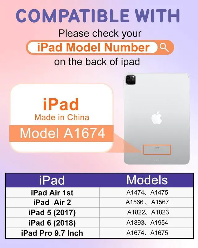 • Compatibility: This case is only compatible with Apple iPad 5th/6th generation (2017/2018), iPad Air 1st generation/Air 2nd generation (2013/2014), iPad Pro 9.7" 2016. Note: It does not fit other models.