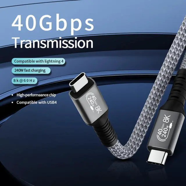 40Gbps, Fast moving Files 40GBps provides extremely fast file transmission. The ultra-high speed data transmission rate of up to 40GBps enables easy and fast file transmission of music, movies, series, photos, videos, etc. at the rate of 40GBps per second. ^^ Up to 8K UHD Video notebook to USB-C can present up to 8K@60HZ HD expansion of, can support mobile phones, tablets, laptops, desktops, hard disk boxes, lightning displays. ^^ 240W, Leading Fast Charging Tech USB4 data cable 240W (48V/5A) high-power super fast charging can charge USB-C equipment at high speed.