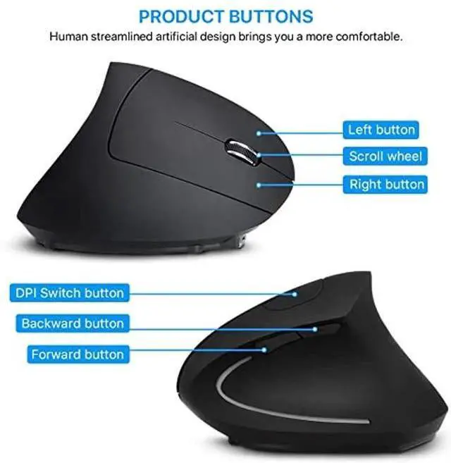 Ergonomically DesignedYour wrists will thank you once they feel the relief an ergonomic mouse can provide. The ergonomic design comfortably cradles your hand in a natural, neutral position so you can avoid pain while you work. ^^ Easy to Use & High-Precision Mouse ControlThis cordless mouse, just plug and play. USB receiver is at the bottom of wireless mouse and very convenient to storage. 800 / 1200 / 1600 DPI Resolution Optical Tracking Technology provides more sensitivity than standard optical mice for smooth and precise tracking on a wide range of surfaces. ^^ Rechargeable Wireless Mouse & Intelligent Auto-SleepThis Wireless ergonomic mouse built-in rechargeable battery and includes USB charging cable.