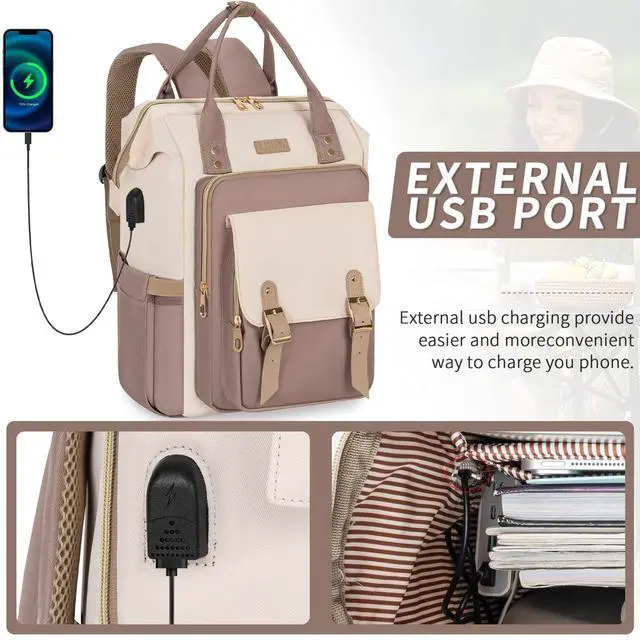 • USB Charging Port for Work Backpack: This USB charging backpack features a convenient external charging port and a built-in charging cable, allowing you to charge your phone anytime, anywhere. It's a great gift for your wife or daughter. Please note: It requires a power bank to operate; it does not store power. USB charging port only offers an easy access to charge