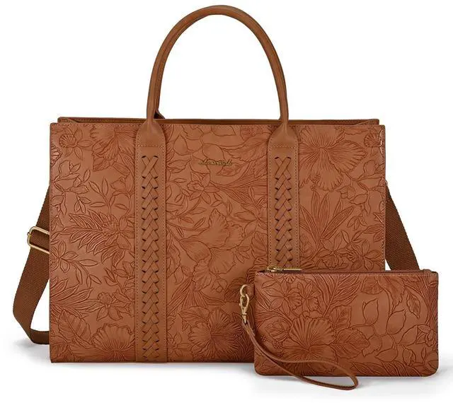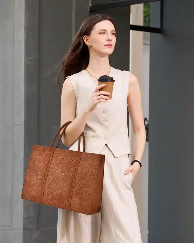 Perfect Size Laptop Bag: Measuring 16.3" x 6" x 12", this multi-pocket leather tote bag boasts ample space with a thick padded laptop compartment (For 13"/14"/15"/ 15.6" laptops), tablet slot, and various pockets for great organization, ensuring a secure and organized commute, daily use or business trip. Designed for the professional modern woman, the leather laptop bag for women marries elegance with functionality. ^^