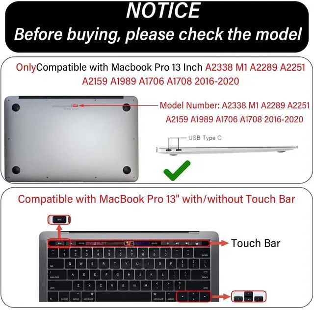 CompatibilityThis MacBook Pro 13 inch is only compatible with 2020, 2019, 2018, 2017, 2016 (A1706, A1989, A2159, A2251, A2289, A2338) Please check the model number "AXXX" on the back of your MacBook before buying, make sure you choose The model number is "A1706" or "A1989" or "A2159" or "A2251" or "A2338" or "A2289" in the title, and the rest of the protective cases are not compatible with other models of laptops. ^^ Full Access to All PortsPrecise cutouts allow full access to all ports and functions, and the Mac case case is fully ventilated for safe cooling, insert cables, chargers or headphones without removing the case, convenient snap design, installation and removal Convenient! ^^ Protection cover No cutout design, transparency varies with color.