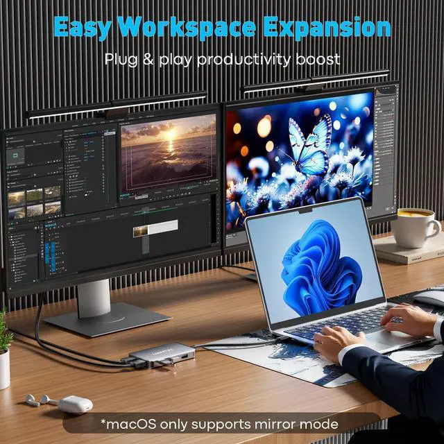 Note: Dual-video expansion is only available for Windows, macOS only supports mirror mode. ^^ Multi-scenario Application & Desktop SimplificationDocking Station Dual Monitors Adapter meets the needs of office meetings, home entertainment, multi-screen speculation and other scenarios, a line of connectivity to solve the problem of external displays, data transmission, device charging, say goodbye to the clutter of cables and create a clean and efficient workspace.