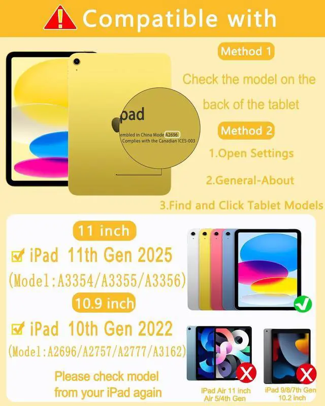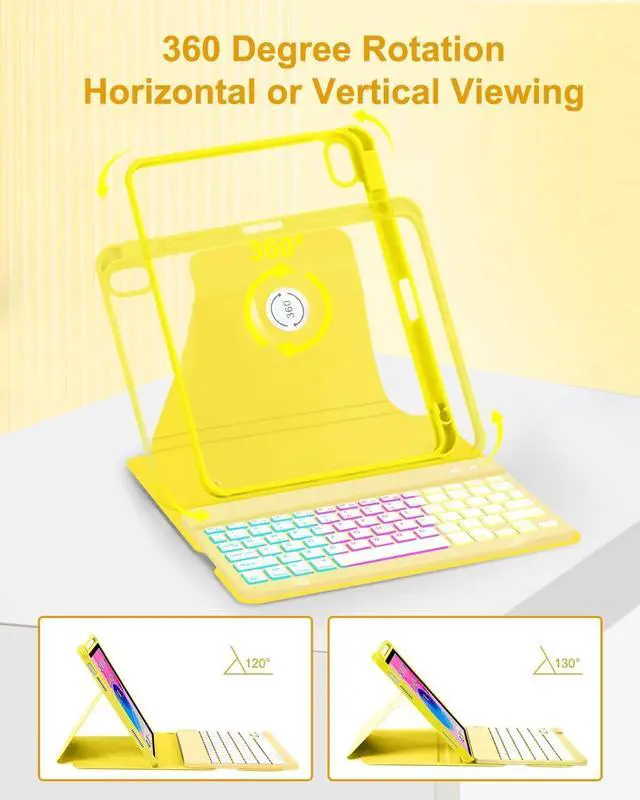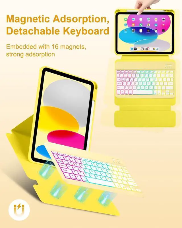 Generation (Model Number: A2696/A2757/A2777/A3162). Please check the model number starting with "AXXXX" on the back of your iPad before purchasing. (This product does not include: tablets, pencils! ) ^^ 7 Colors Rainbow Backlight KeyboardThe RGB rainbow backlight keyboard for iPad 10th generation can provide you with a typing experience in the dark, and the backlight has 7 adjustable colors. These colors can be automatically switched in breathing light mode, and the brightness of the keyboard can be adjusted by pressing Fn+light key. When you don't need the backlight, you can turn it off ^^ Rechargeable Keyboard, Long-Lasting Battery LifeThis keyboard has a built-in 400 mAh lithium battery, which charges for 2-3 hours and can work continuously for up to 50 hours under normal use (without backlit ), which will automatically enter sleep mode when not used for a long time to save power, and click any key to instantly the wake-up. Standby state lasts up to 90 days, which is very friendly for travel and mobile office ^^ Multi-Function Keys, Detachable KeyboardRich function shortcut keys allow you to use your iPad more efficiently and comfortably, such as editing documents, browsing applications, and creating presentations. The detachable keyboard can be used alone and can be disassembled when not in use, which is very convenient to carry ^^ Strong Magnetic Adsorption, 360-Degree RotatableThis protective case is made of premium PU leather and has 16 built-in powerful magnets, which can firmly absorb the keyboard to prevent the keyboard from moving and falling.