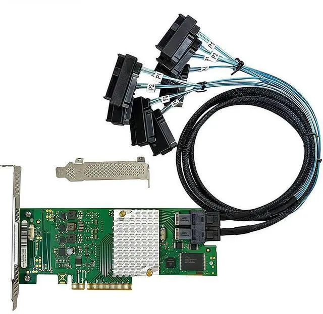 Cables: 2 SFF-8643 4 SAS 8482 breakout (connect up to 8 SAS drives). Cables in box are for SAS drives. They are not compatible with SATA drives. To connect SATA drives, use SFF-8643 to 4 SATA cables (sold separately) or our matched HBA + cable kit.