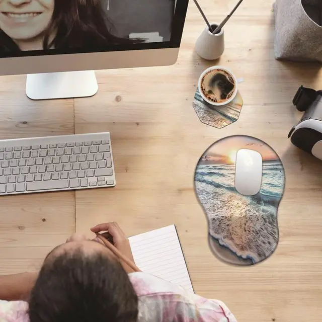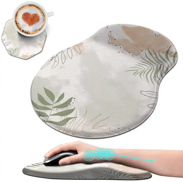 Unique Shape and Size-- 13x 8.66 x 0.86 inches; Coffee Coaster 4" x 4" x 0.08" mouse wrist rest pad fits all types of mouse, wired, wireless, mechanical, laser & optical. The reinforced edges of mousepad prevent deformation and damage to guarantee long term use. High quality materials-- This mouse pad is made of memory foam with no additives or fillers. And the cover is made of soft and smooth fabric, no irritation to skin, is able to track the mouse movements fast and accurate. Not easy to curl up on the edges even after long time usage.