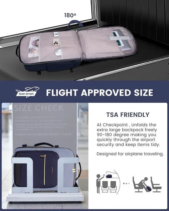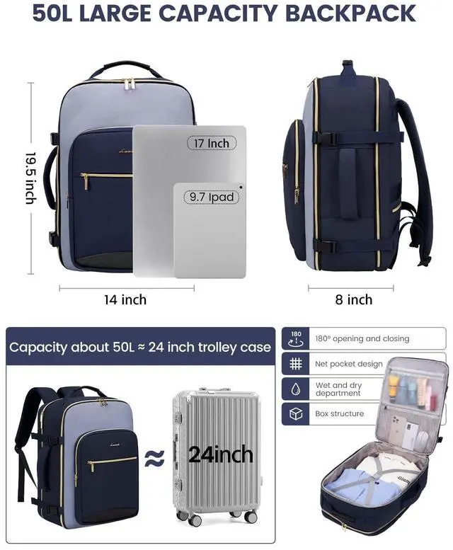 Versatile & Airline ApprovedMeasuring 19.5 *14*8 inches, this carry on backpack fits under the seat or in the overhead compartment, approved by Spirit, Frontier, JetBlue, and other budget-friendly airlines, making it the perfect personal item for air travel. ^^ Spacious & OrganizedWith a 50L capacity, 4 compartments, and a lot of pockets, designed to allow you to easily separate and organize your travel personal items, this travel backpack can accommodate 7-9 days worth of travel items. ^^ 3 Extra Packing Cubes & Wet PocketsThis carry-on bag includes 3 extra packing cubes 2 storage bags and a shoe bag as well as a built-in wet compartment pocket.