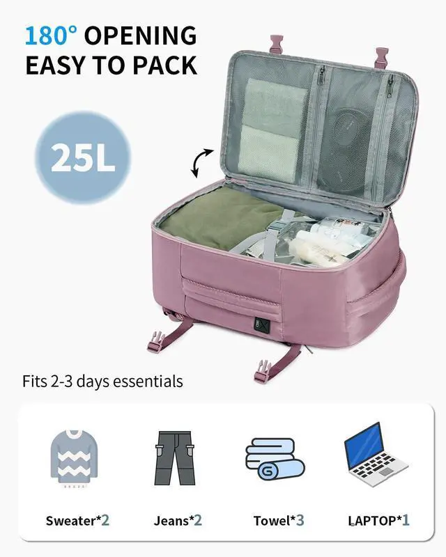 Easily Meet Airline Size Restrictions Designed for low-cost carriers United Airlines this 17-inch backpack fits perfectly under the seat fully complying with the strict 41 linear inches standard Its exclusive suitcase-style expandable structure plus external compression straps hold 4-7 days of clothing 5 sets of outfits shoes toiletry bag while still fitting under the seat. Skip checked baggage fees and board with zero questions ^^ End the Hassle of Rummaging This backpack features 16 scientific compartments for organization enthusiasts an independent shockproof laptop compartment fits 15.6 -inch laptops tested for larger sizes a hidden anti-theft back pocket for quick passport wallet access side water bottle mesh pockets and a top quick-access compartment The main compartment opens fully like a suitcase.