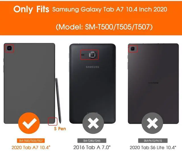Designed for 2020 New Galaxy Tab A7 10.4 - Exclusively designed for Newest Samsung Galaxy Tab A7 10.4 (SM-T500/T505/T507, 2020 Released) ^^ Designed for Folio Stand - With dual standing positions for enjoying the most comfortable viewing angles ^^ Designed for Full Protection - Hard PC back shell protect your new Galaxy Tab A7 10.4 from shocks, drops and impacts ^^ Designed for Snug Fit - With precious cutouts and full access to all features (Cameras, Speakers, Ports and Buttons) ^^ Designed for Secure Closure - Magnet secure the case closure, it's easy and safe to snap on and off