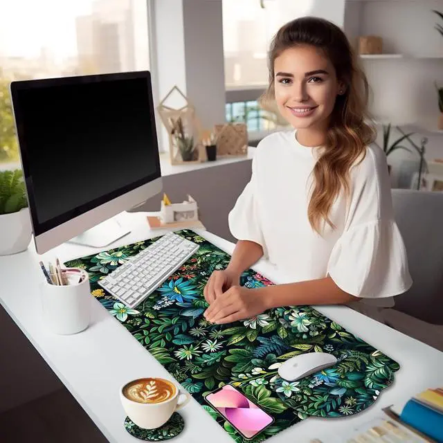 Mouse Pad Set: The gaming mouse pad set includes large green desk mat ( 35.415. 7inch), mouse pad with wrist rest( 9.8 x 8.6 inch), keyboard wrist rest ( 17.3 x 3.15 inch), flower cup coaster ( 3.9" x 3.9" ). The extended desk pad fits almost full-size keyboards and mice, providing plenty of space for gaming or office work ^^
