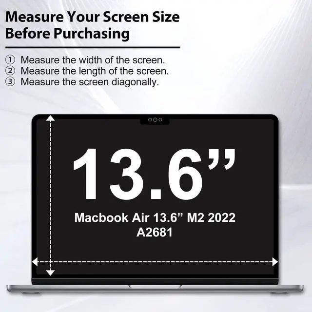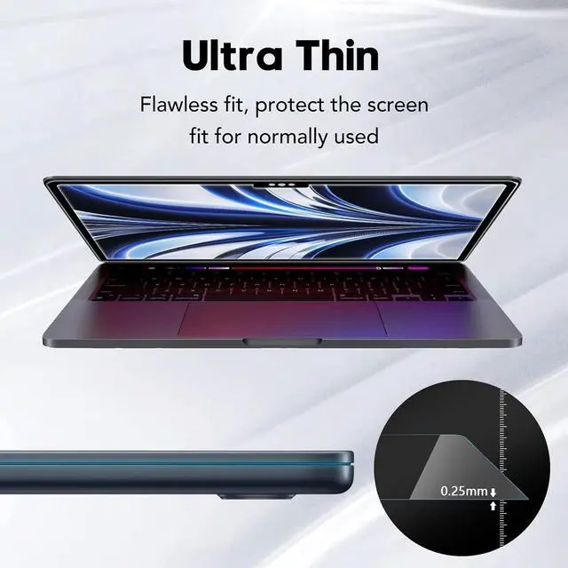 Compatible ModelTempered glass for Macbook screen film for laptop is specially designed for for for New for Macbook Air 13.6 inch (M2 2022, A2681), Please check your for Macbook's model and size firstly and make sure it is perfectly fit before buying ^^ Easy Installationfor Macbook Air 13 inch screen protector offers unparalleled protection without the hassle of bubbles and white sagging lines, and crystal-clear viewing without any distractions. Different from universal for macbook laptop tempered films that stick to the entire screen, our tempered glass screen film designed to stick to the screen bezel only, making installation easily.