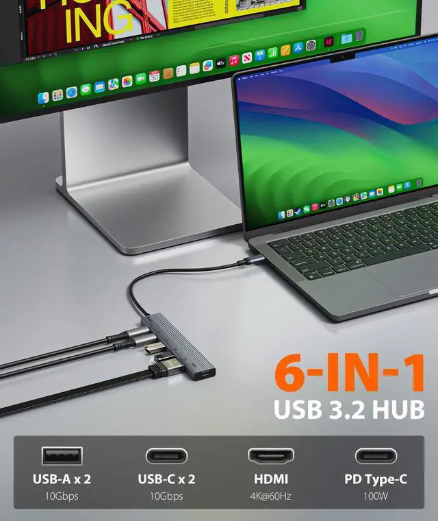 HUB: Aceele USB C multiport equipped with a 4K 60Hz HDMI port, a 100W USB-C Power Delivery Port, two 10Gbps USB-C data ports, and two 10Gbps USB A data ports, Inspire more potential of your laptops USB-C port. ^^ USB 3.2 Gen 2