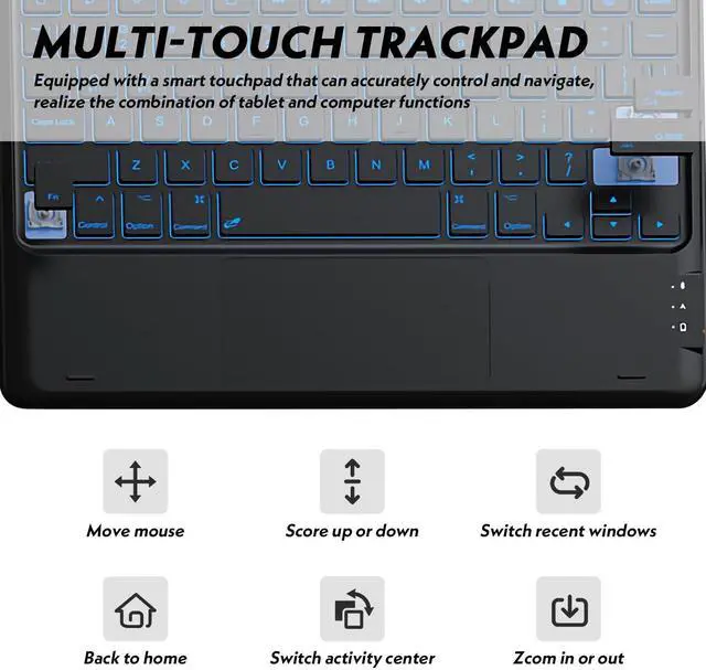 >>Interior: soft microfibre protects your tablet from being scratched; Anti-slip material prevents the tablet from sliding down. Turn Your Tablet into a Laptop>>Wireless keyboard connects to your tablet automatically, making typing faster and more accurate than on a touchscreen. >>Made of ABS material, well-spaced keys enable users to type smoothly, providing a pleasant typing experience for users.