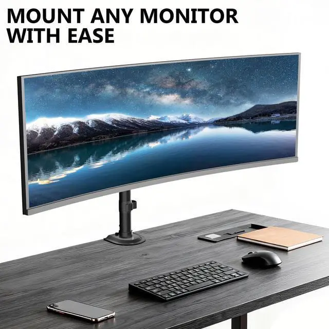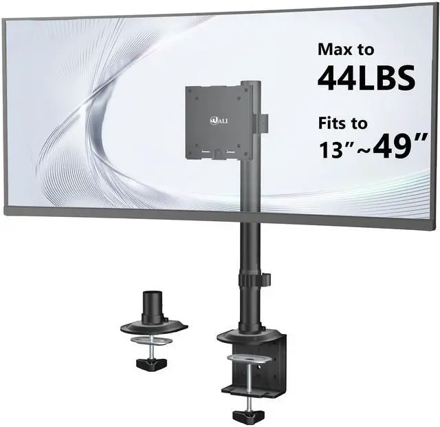 Ultrawide Compatibility: Engineered with heavy-duty materials, this single monitor arm reliably supports up to 44lbs and fits screens from 13 to 49 inches. It ensures stable performance for a single, large monitor or an ultrawide display. The universal 75x75mm & 100x100mm VESA compatibility offers a perfect fit for most monitors on the market.