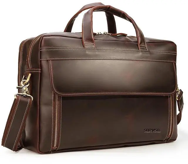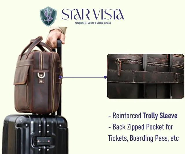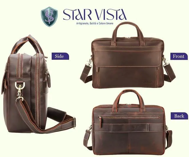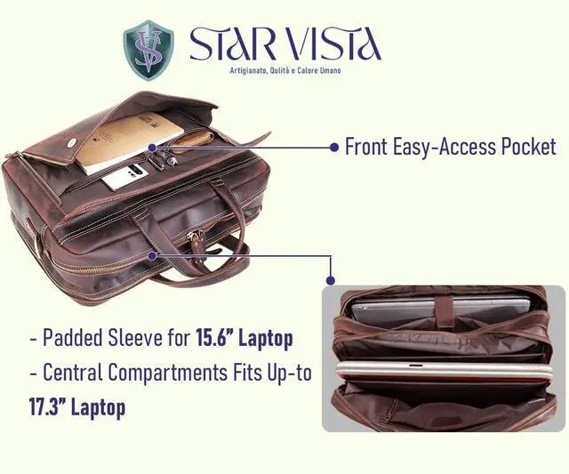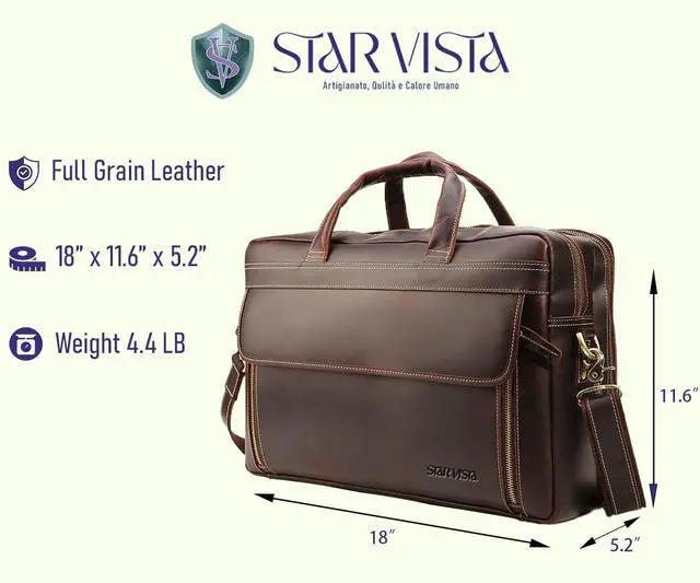 QUALITY / CRAFTSMANSHIP -- Crafted with full grain cowhide leather sourced from premium pastures, tanned with natural plant extracts, this STAR VISTA briefcase is built to last with a professional look and feel for either daily commute or business travel. YKK zippers along with other robust brass hardware ensure the briefcase's durability in its everyday use for many years to come ^^ ROOMY INTERIOR -- Featuring 2 large compartments and variety of front/back and interior zipper pockets, this briefcase features a 15.6" laptop sleeve and large compartment which fits up to 17.3" laptop. Variety of pockets are designed for pads, phones, wallets and other essentials, satisfying all your daily or travel needs, while keeping everything organized ^^ DIMENSION / WEIGHT -- 18" (W) x 11.6" (H) x 5.2" (D).