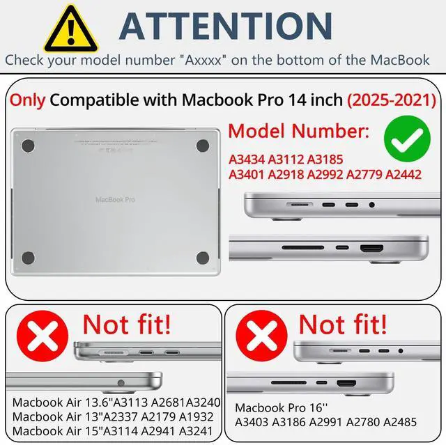 • COMPATIBLE MODELSOnly Compatible with with MacBook Pro 14 inch 2025 2024 2023 2023 2021 released with M5/M4/M3/M2/M1/Pro/Max Chip with Liquid Retina XDR Display&Touch ID (Model: A3434 A3112 A3185 A3401 A2918 A2992 A2779 A2442). Please double check your laptop's model number "Axxxx"