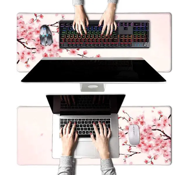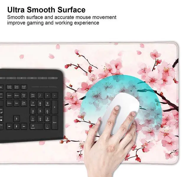 Pink Cherry Blossom Japanese Large Mouse Pad, Desk Mat Computer Keyboard Pad Non-Slip Rubber Base Waterproof with Stitched Edges for Laptop Gaming, Office & Home 31.5 x 11.8 Inch