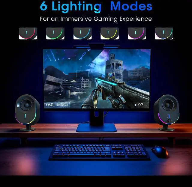 Vibrant RGB Ambiance Lighting: Transform your desk speakers or gaming setup with 6 customizable lighting modes. This monitor speaker feature enhances immersion, bringing gaming and movies to life with dynamic hues. ^^ Intuitive Front
