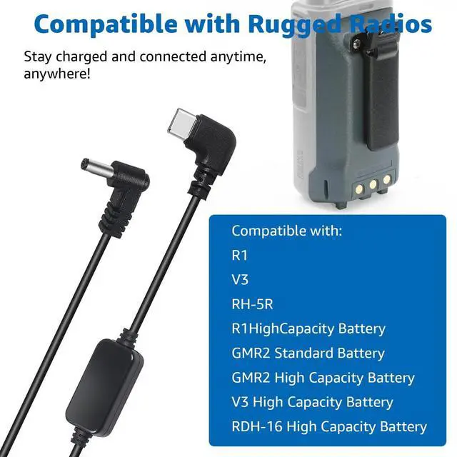 Universal Charging Solution:Power up your essential for Rugged Radios equipment directly from any USB C port.This versatile cable is compatible with a wide range of V3,R1,GMR2,and RH5R models and their corresponding batteries
