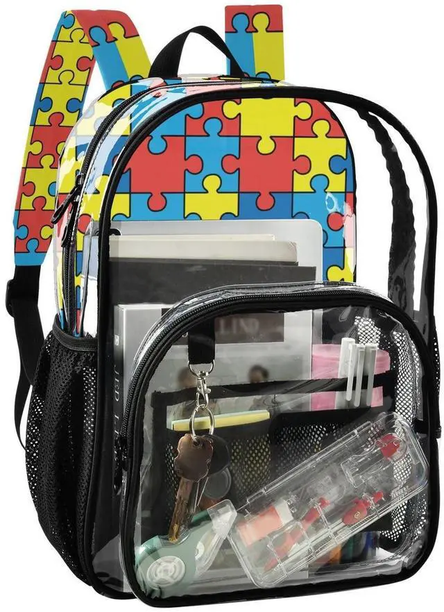 Dimensions: 27x13x40cm ( 10.6" x 5.1" x 15.7" ) fits laptops up to 14 inches. ^^ Stylish & Durable Design- Made of polyester with transparent PVC body, featuring vibrant prints on both sides of the back panel and adjustable shoulder straps. ^^ Smart Organization System- Main compartment + front flap pocket with inner mesh slot & keychain + dual side mesh pockets. Perfect for water bottles, umbrella, stationery, and daily essentials. ^^ Lightweight & Occasions- Light PVC material ( 0.45 ~ 0.56 KG). Ideal for college, work, travel, festivals, sports, and any outdoor activities. ^^ Easy Maintenance - Wipe clean. No machine wash/bleach.