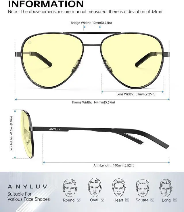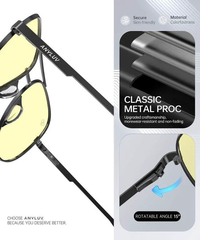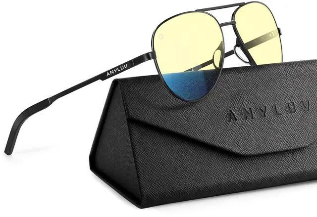 LIGHTTWEIGHT & All-Day COMFORT: ANYLUV's blue light glasses are made of lightweight materials, Features featherlight metal arms (under 25g) and a seamless nose pad designed to eliminate pressure points. Forget sore ears or nose bridgeswear these glasses comfortably for 12+ hours. ^^ CLASSIC AVIATOR STYLE FOR MODERN MEN: Inspired by timeless pilot frames, these glasses combine a sleek matte black finish with subtle metallic accents. Elevate your look while protecting your eyesperfect for work, dates, or casual outings.