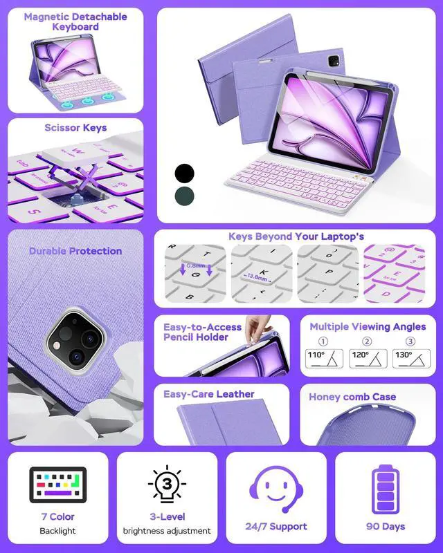 Versatile iPad Keyboard CaseEnhance your iPad experience with this versatile iPad keyboard case, designed specifically for iPad 11 inch (M2 2024). It features a magnetic detachable keyboard and 3 notch design for easy typing and convenient use. ^^ Long-Lasting Battery LifeEnjoy long-lasting battery life with this keyboard case, allowing you to quickly charge your keyboard in just 2 to 3 hours, providing up to 9 days of standby time on a single charge, so you can enjoy long-lasting battery life. ^^ Quiet Typing ExperienceStay productive without disturbing others, thanks to the anti-removal keys and noise reduction technology.