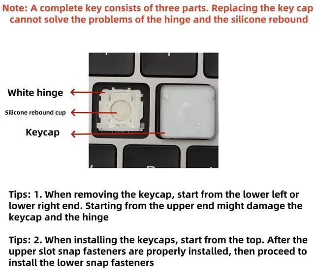 Note: If the silicone rebound cup device under the keycap or the white hinge is lost or damaged, replacing the keycap will not solve the problem