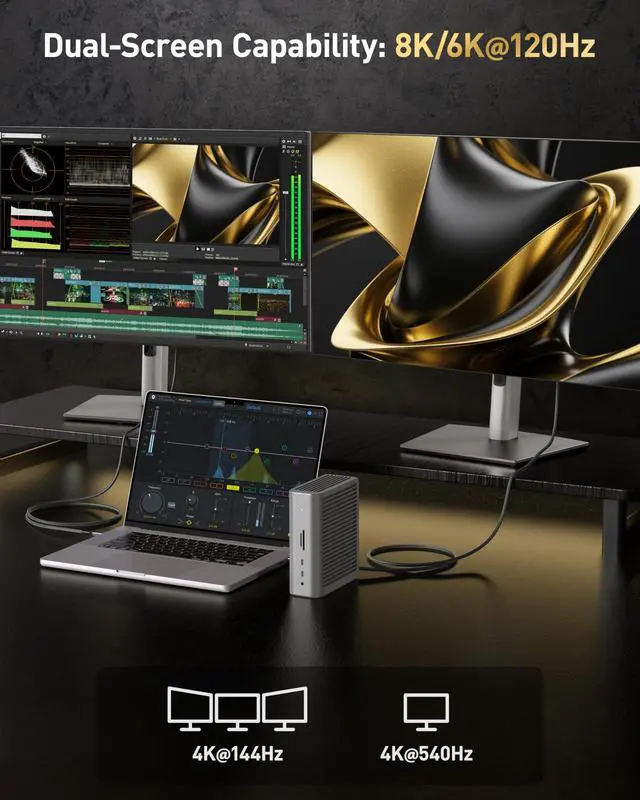 Video Bandwidth: Experience ultra-fast 80Gbps bi-directional data transfers3x faster than Thunderbolt 4for seamless 16K video editing, 3D rendering, or massive file backups. Boost productivity with zero lag, even at peak loads ^^ Pro-Grade Dual 8K/6K