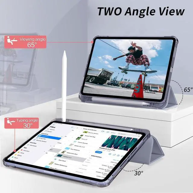 Note: Not included Pencil ). ^^ Durable Protection Front lid of this iPad pro 11 case is covered with premium textured soft PU leather, back is made of hard PC material + soft TPU side. The PU surface is soft as silk, providing a comfortable touch for the skin. The soft TPU edge side provides full body protection to prevent scratches. Moreover, the hard frosted PC back shell can maximize the protection of your iPad from being damaged and scratched and provide a stable writing mode stand. ^^ Auto Sleep & WakeBuilt-in magnetic strip, our iPad pro 11 inch case 4th generation automatically wakes or puts your tablet to sleep when the lid is opened and closed, which can protect and extend the battery life. Easy access to all features and controls with precise hole position. ^^ Two Viewing AnglesThe shell design of the trifold stand can easily change the angle to meet your viewing and typing needs. 65 video mode can act as a screen stand; 30 input mode acts as a keyboard stand, which will greatly free your hands when relaxing or working with your iPad.