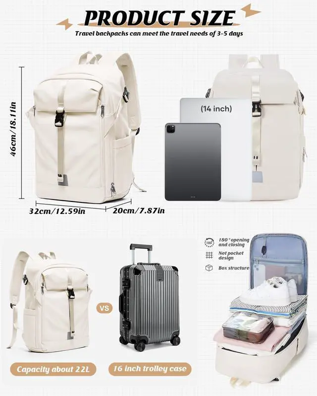 Vacuum Travel Backpack: This travel backpack size (L * W * H) 32*20*46cm( 12.59 * 7.87 * 8.11 inch). Carry on Backpack suitable for air travel, easy to place under luggage racks or seats. The trolley sleeve works with luggage to make traveling more convenient.