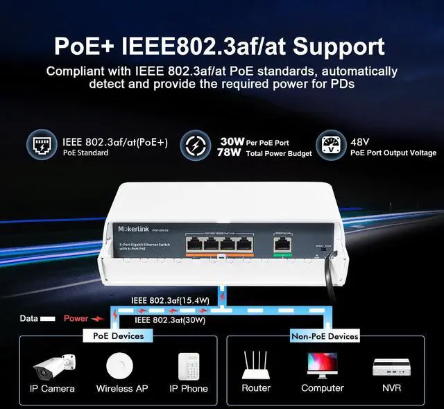 ^^ High POE Power: Maximum support 78W high output power, built-in power supply makes installation easier. Support IEEE 802.3 af/at, each port max power supply reached 30W.
