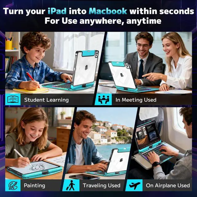 Precise Keyboard Case Fit This keyboard case is specifically designed for the 2025 11-inch iPad (A16 chip) and the 2022 10.9 -inch iPad (A16 chip), providing a smoother user experience for the iPad A16 case keyboard. ^^ iPad A16 Case with Keyboard Stand that Can Rotate 360The bearing hinge design supports 360-degree rotation, allowing you to find the most comfortable viewing angle for your iPad keyboard case from any angle. ^^ Keyboard Case Suitable for Convenient Use in Multiple ScenariosWhether working from home, studying on campus, or traveling outdoors, this keyboard case for iPad A16 can be used seamlessly.
