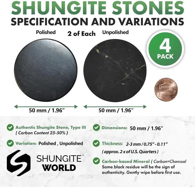 • Shungite Stickers Set: 4 pcs, 50 mm / 1.96" Polished and Unpolished (2 of each) Self Adhesive; Crafted from solid type III shungite; carbon content 25-50%; with trace amount of carbon C60 fullerenes; Sourced from Zazhoginsky deposit, Republic of Karelia
