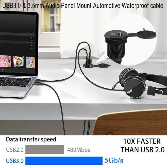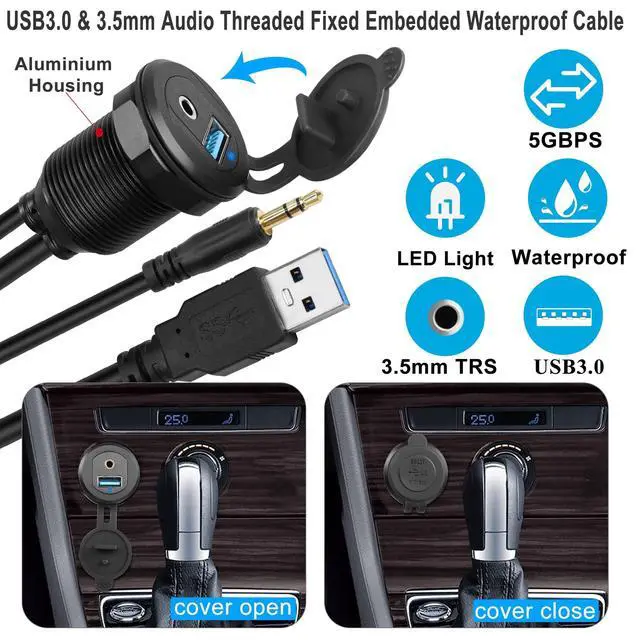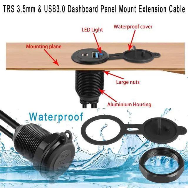 5Gbps USB 3.0 & 3.5 mm Audio Embedded Automotive Dashboard Panel Mount Waterproof cable. USB 3.0 data charging and 3.5 mm audio 2 in 1 output, the 2 cables are independent of each other and can be used for data transfer or charging of USB devices and audio transmission at the same time without interfering with each other. Equipped with M26 x 1.5 aluminium nut, simply cut a 27mm hole in the dashboard and fix it with the nut to extend and expand the USB 3.0 and 3.5 mm audio ports. Ideal for extending both the USB 3.0 and 3.5 mm audio ports of dashboards and electronic devices in cars, trucks, motorbikes, boats, yachts, etc.