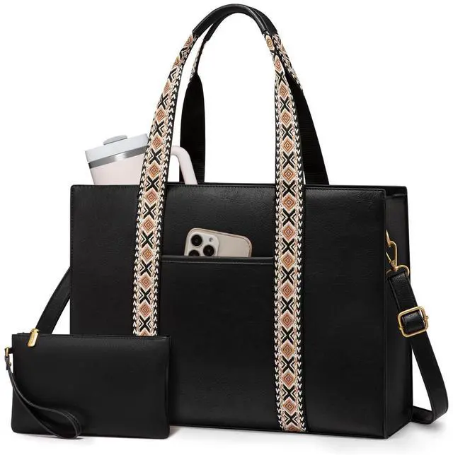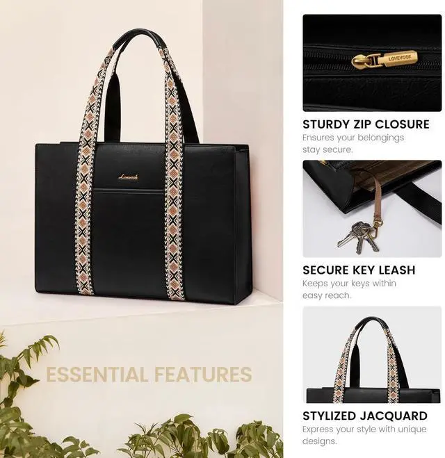 ^^ Multi-pocket Work Tote: This women's work bag offers 11 pockets, including padded sections for electronics and space for a water bottle. It accommodates a 15.6 -inch laptop, iPad, files, books, and clothes. Designed to be more versatile than other laptop totes, it's perfect for long office hours and business trips. ^^ Convertible & Chic Practical Tote Bag: Featuring an additional zip closure and front pocket, this bag ensures your items are easily accessible and secure. A retractable keychain hook helps you grab your keys effortlessly. Four metal feet protect your bag from damage. ^^