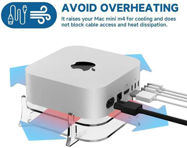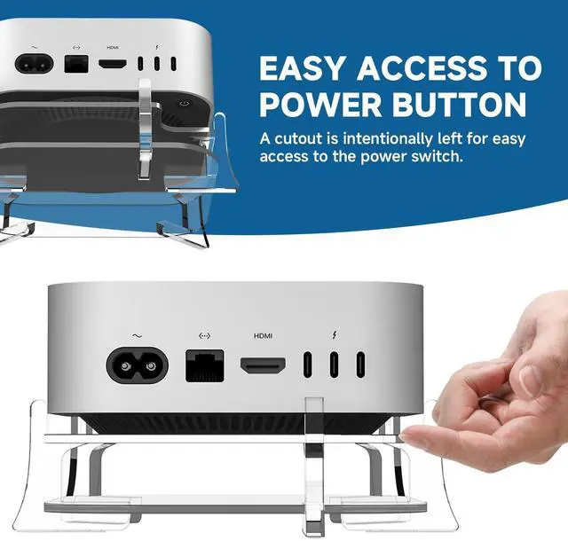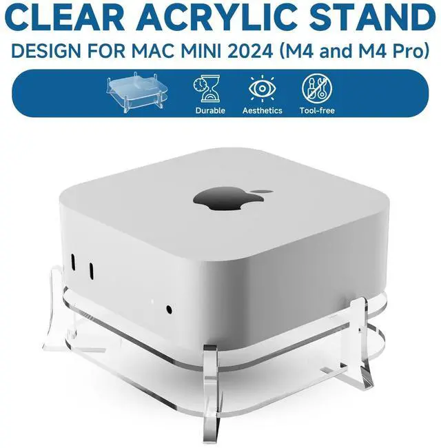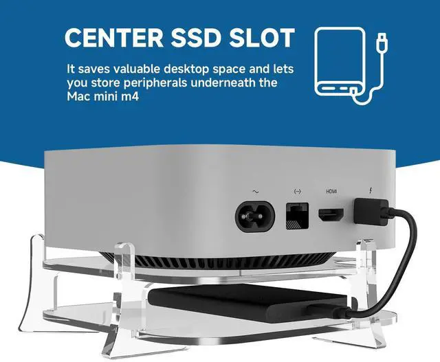 Note: Stand only - Mac Mini M4 and accessories are sold separately. ^^ Convenient Power Button AccessA thoughtful cut-out in the stand provides easy access to the power button located on the bottom of your Mac mini m4, making it simple to power on or off without any hassle. ^^ Space-Saving DesignThe central slot in the stand is perfect for holding small external hard drives, such as SSDs. This feature not only saves valuable desktop space, but also allows you to neatly store peripherals under your Mac mini m4, keeping your workspace organized and clutter-free. ^^ Enhanced Heat ManagementBy raising your Mac mini m4/m4 pro by 0.59 inches, this stand provides ample space for air circulation, allowing the 2024 Mac mini m4 to efficiently dissipate heat from all sides. ^^ Premium & Stylish SupportMade from high-quality acrylic, this Mac mini m4 desk stand is both stylish and durable. The base has four small non-slip rubber pads to prevent accidental slipping. No assembly required, easy to use.