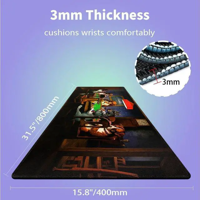 Ultra-Large Size ( 31.5" x 15.8" )Perfect for gaming setups or workspaces, covering your desk and providing ample room for keyboard, mouse, and accessories. ^^ 3mm Thick & ComfortableCushioned thickness ergonomic wrist support reduces fatigue during extended computer sessions, smooth fabric surface reduces wrist strain. ^^ Natural Non-slip Rubber BaseEco-friendly anti-slip grip keeps mat firmly in place during intense use. ^^ Ultra-Smooth Fabric SurfaceOptimized fabric surface ensures precise mouse tracking & low friction for both work and speed gaming. ^^ Stitched Edges for DurabilityExtra-large desk mat with premium stitched edges to prevent fraying, it's a long-lasting gaming mouse pad/desk mat.
