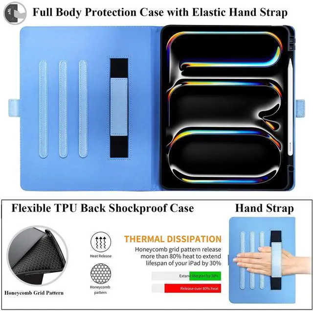 Secure Grip: Equipped with a handy strap, the tablet case ensures a secure grip for confident handling, minimizing the risk of accidental drops. 3. Innovative Pencil Holder & Cards Pockets: A built-in pencil holder offers a secure space for your Apple Pencil, while the additional pockets provide room for essential cards or small documents, thus increasing its utility. 4.
