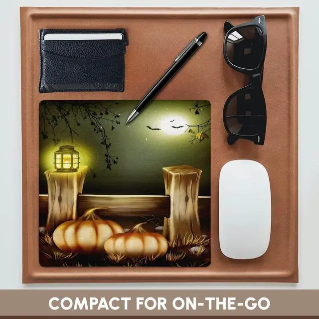 Nighttime Light on a Fence with Pumpkins, Bats and a Full Moon Mouse Pad is 8" x 8" x. 25" and is made of heavy-duty recycled rubber. Matte finish image will not fade or peel. Machine washable using a mild detergent and air dry.