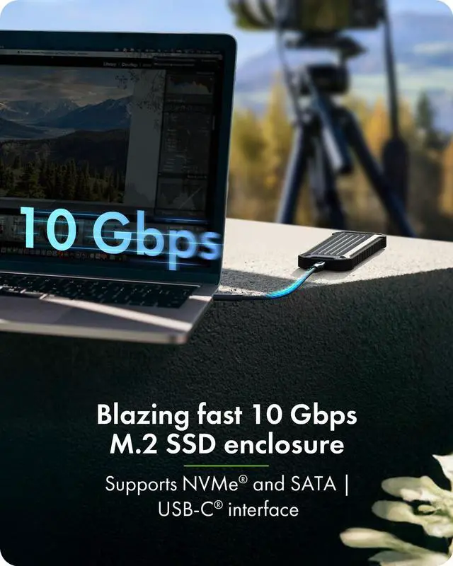 [Supports Both NVMe & SATA M. 2 SSDs] Compatible with M-Key and B+M-Key SSDs (NVMe & SATA), this enclosure fits M. 2 22302280 drives and supports up to 4TB. Ideal for flexible workflows and upgrading existing storage. ^^ [Durable Full Metal Build] Built for the field with a solid metal housing that resists dust and shock. A dependable choice for photographers, videographers, and mobile professionals working in tough environments. ^^ [Portable with Lanyard for Easy Access] Compact and lightweight with an included lanyard, it easily attaches to your camera bag or gear loop so your files are always within reach on location or during travel.