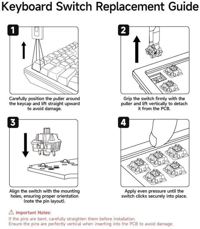 ^^ MX Structure Fully Compatible ShaftsThis mechanical keyboard switches adopts the standard 5-pin MX cross structure, which is designed for seamless compatibility with most MX-style mechanical keyboards, and can be adapted to most of the keycaps with (X) -cross shafts, which greatly improves the compatibility of this switches keyboard, and you can change the axle body at will, enabling you to easily and freely! Mix and match axes to create a customized feel! Enjoy the convenience and precision of a finely crafted typing experience. ^^ Professional Silent TechnologyEach keyboard switches is made of POM material shaft and PC shell, designed to minimize friction and wear and tear, ensuring long-lasting performance under countless gaming battles and high-intensity typing workloads.