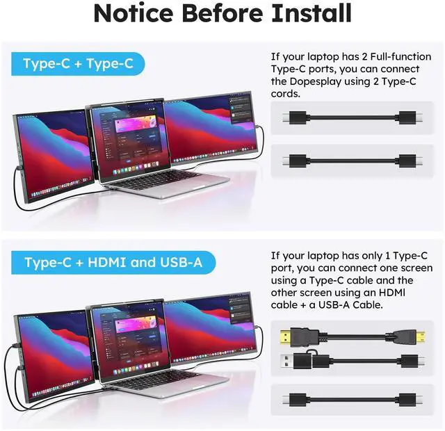 Notice Before PurchasingBecause of the limitations of the chip, Macbook users need to download the driver to use both screens properly, otherwise only one screen will light up. Please don't hesitate to contact us for the driver. And you need to connect your USB 3.0 port to the type-c port in the center near the button. ^^ Portable Laptop Screen Extender for ProductivityDue to a decent size, detachable and foldable design, Dopesplay 15.6" triple laptop screen extender offers you fits easily into your travel backpack. Easy to carry and install. The vertical/ horizontal screen positions provide more convenience for your daily work.
