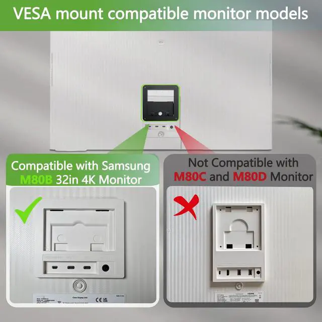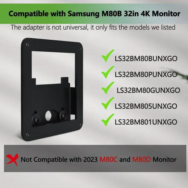 Compatibility: Compatible with 2022 M80B (LS32BM80BUNXGO, LS32BM80PUNXGO, LS32BM80GUNXGO, LS32BM805UNXGO, LS32BM801UNXGO) The adapter is used to solve the compatibility problem of VESA bracket installation, supporting two hole modes of100x100mm.