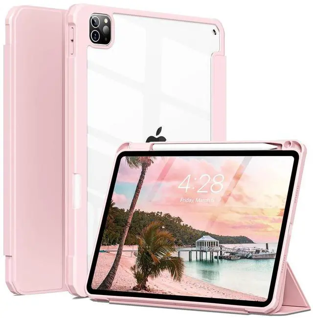 ZKTUYU Case for iPad Pro 12.9 Inch (6th/5th/4th/3rd Generation 2022/2021/2020/2018) with Pencil Holder, Clear Transparent Back Shell Slim Stand Shockproof Tablet Cover, Auto Wake/Sleep, Pink