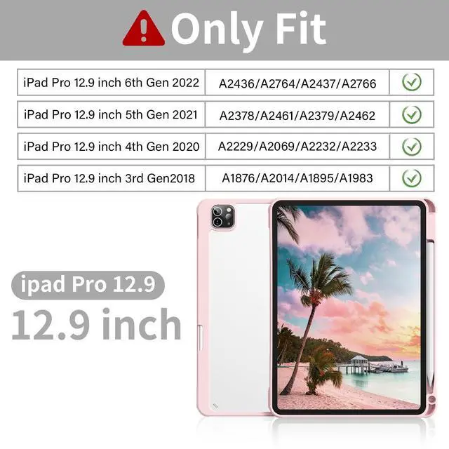 • Compatibility ModelDesigned for iPad Pro 12.9" 2022 6th Generation (Model: A2436 / A2764 / A2437 / A2766 ), 2021 5th Gen (Model: A2378 / A2461 / A2379 / A2462), also fits iPad Pro 12.9 inch 2020 4th Gen (Model: A2229 / A2069 / A2232 / A2233) & 2018 3rd Gen (Model: A1876 / A2014 / A1895 / A1983) ONLY. Not compatible with any other iPad Models.Please check the back bottom of your iPad to find the model number.NOTE: Please remove the inner and outer film before putting on this protective case
